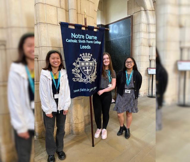 On May 21st Justine Barlow, Principal and Catherine Herring, Director of Catholic Life along with three of our students from the chaplaincy group, attended the Good Shepherd Celebration in Leeds Cathedral. All the schools in the diocese are invited to process with their banners and give a presentation to support the work of Catholic Care in the diocese. The liturgy and choir was prepared and led by staff and students from St Joseph's Catholic Primary School, Hunslet. They were supported by a visiting choir from Vanderbilt University Blair School of Music, Nashville, Tennessee in the United States. Our own students enjoyed seeing teachers from their primary and secondary schools in attendance but most of all, proudly representing Notre Dame as the only sixth form representatives.